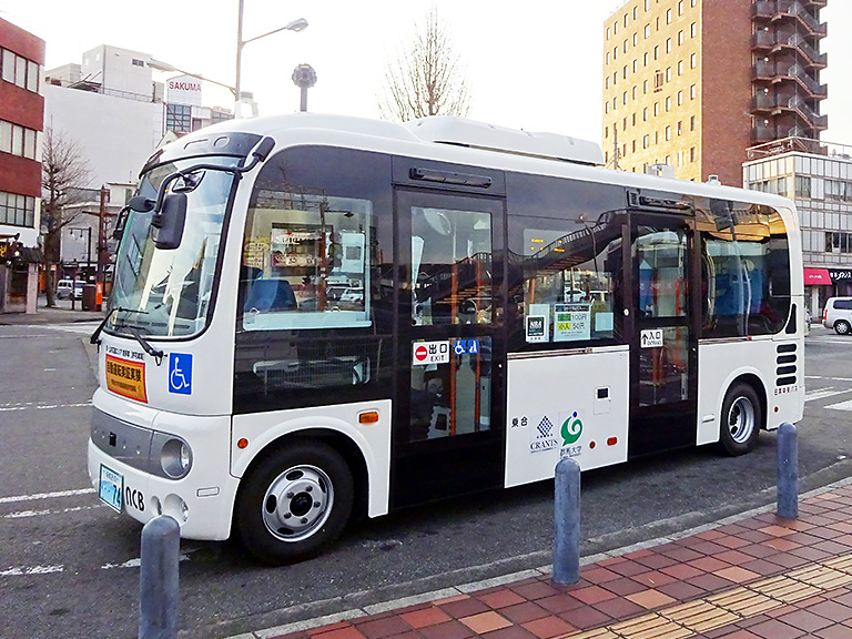 写真=JR前橋駅~県庁ルートを実証実験をした群馬大学の自動運転バス(群馬大学CRANTSのHPより)