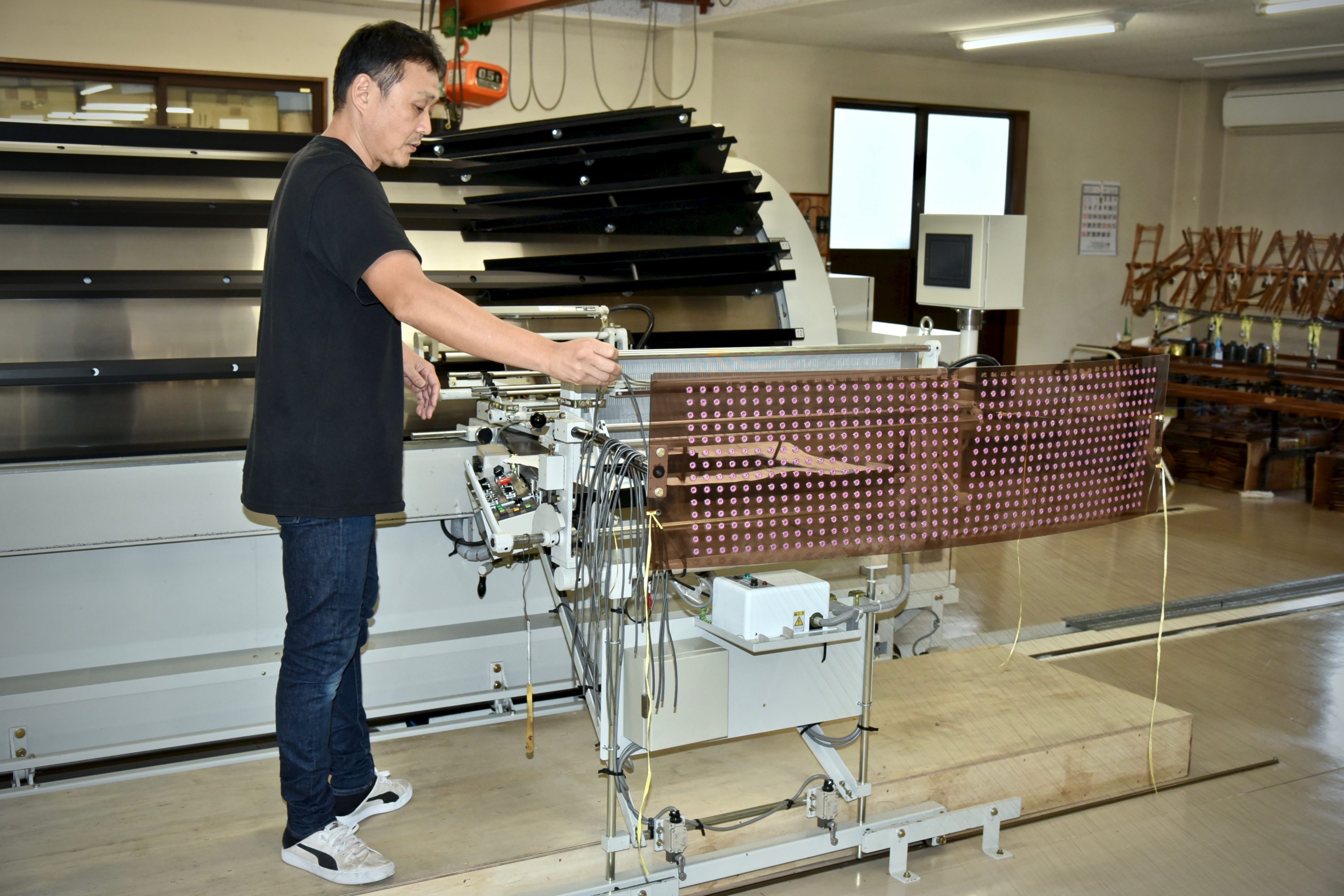 機拵えさんは作業場で作った「架物」を注文主の機屋さんに持ち込み、織機に設置する。現地で通じ糸の長さを最終調整するのはいうまでもないが仕事はそれだけでは終わらず、設置した綜絖1本1本に経糸を通し、さらに緯糸を手前に寄せる櫛のような形の筬(おさ)の羽の間を通して完了する。